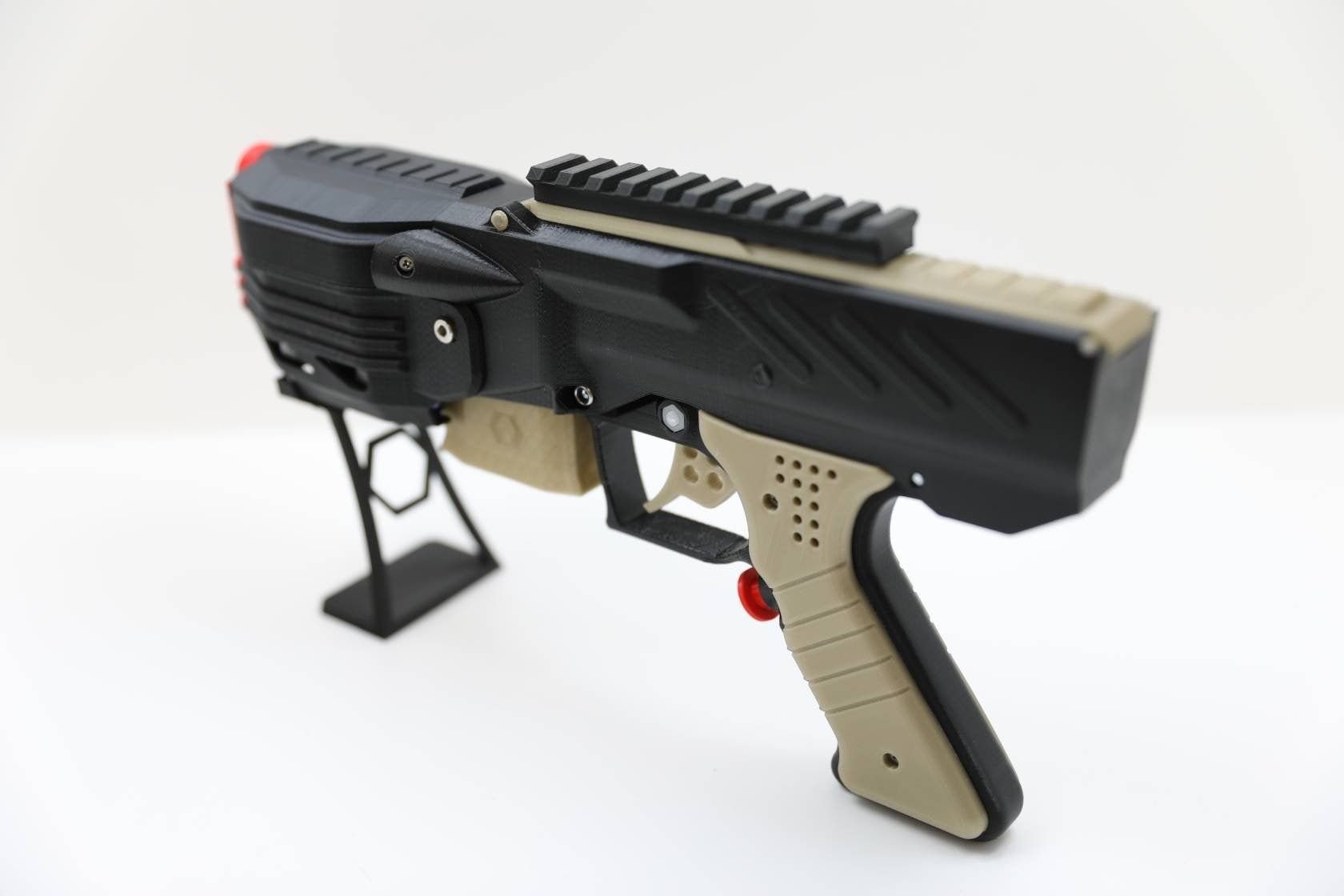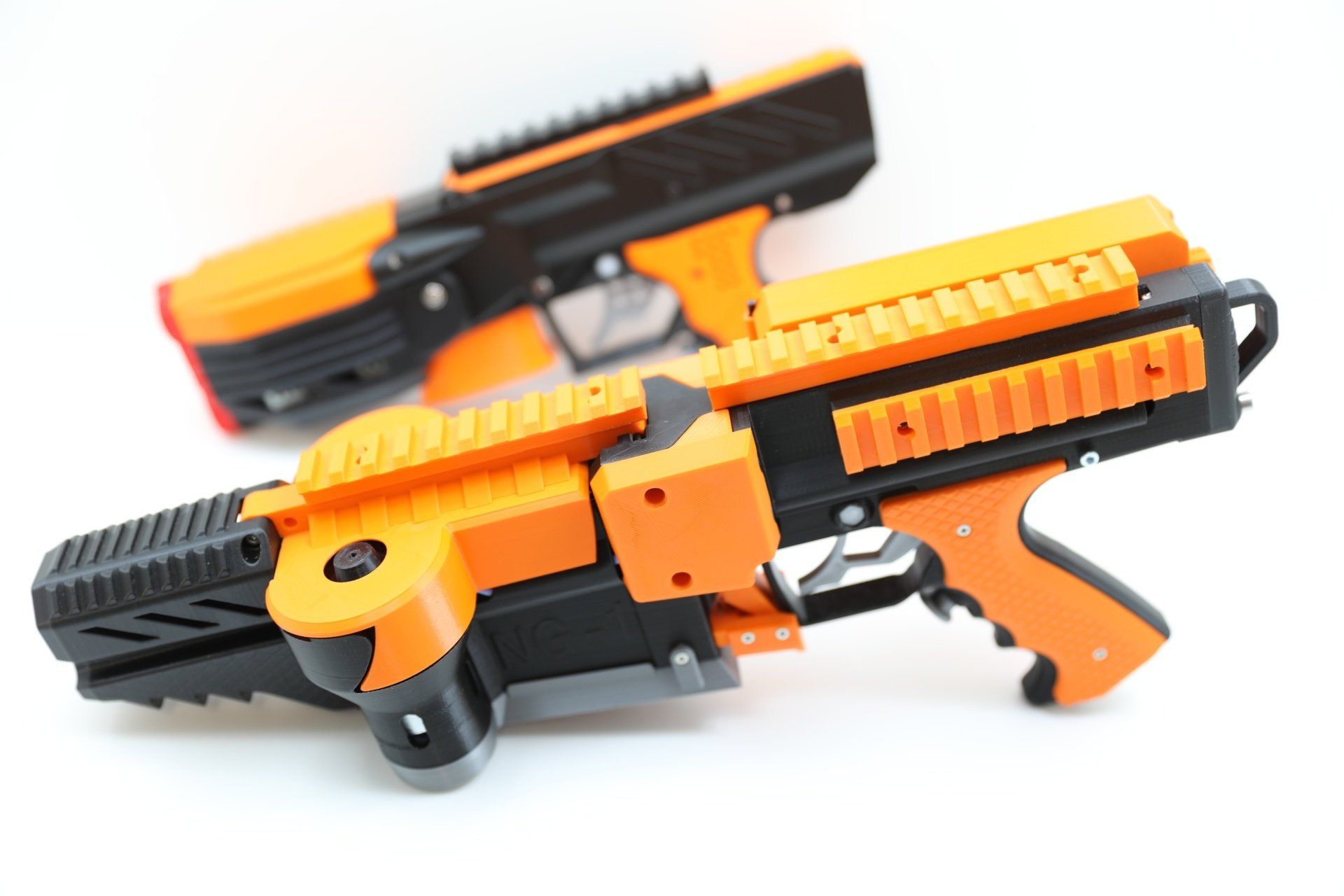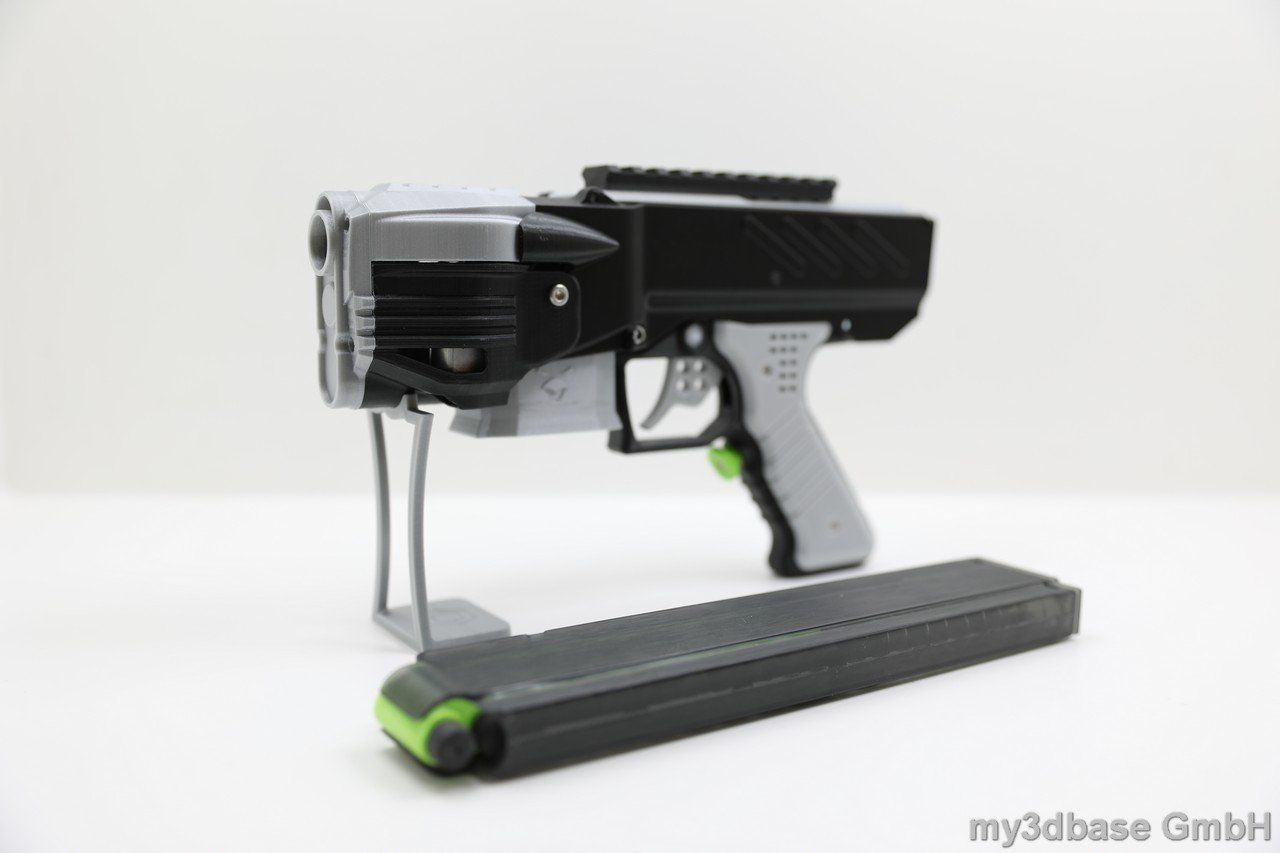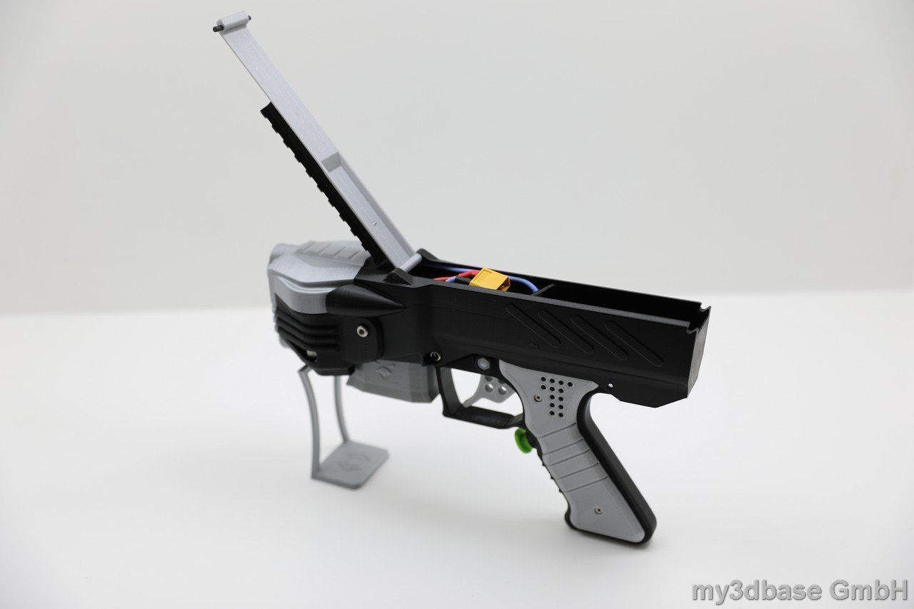 This is how it started. The NG-1 was the first blaster developed by my3dbase. It is designed as a primary featuring large 380 motors. In its basic configuration it is set up to run on a 2s battery. The main body is printed in high quality PLA. Motors are thermally decoupled with ABS washers.