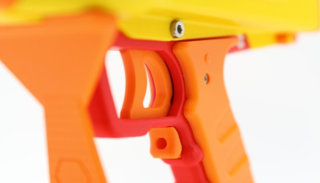 Currently, the NG-3 reaches a max 100fps with a 2s lipo setup. Ball type ammunition has a much shorter acceleration length compared to foam darts. So for the NG-3 the fly wheels had to be changed from the ground up. They are still 3D printed entirely in ABS.
