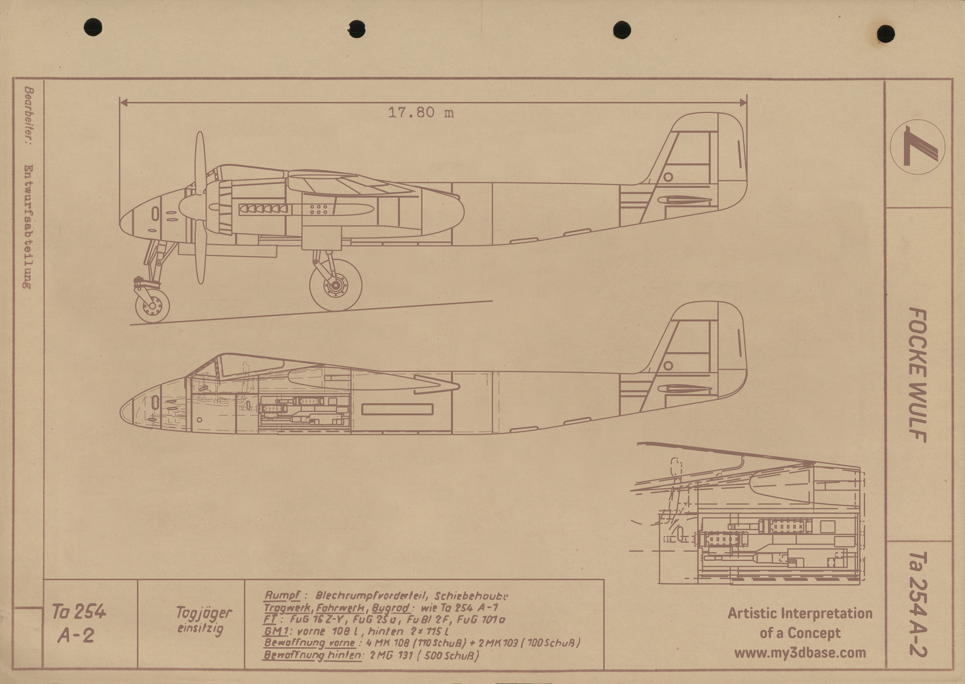 - Ta 254 A-series: These were primarily conceived as two-seat night fighters. Interestingly, some planned Ta 154 D variants were directly renamed into the Ta 254 A-series; for example, the Ta 154 D-1 became the Ta 254 A-1 and the Ta 154 D-2 became the Ta 254 A-3. The Ta 254 A-0 was also a two-seat night fighter.