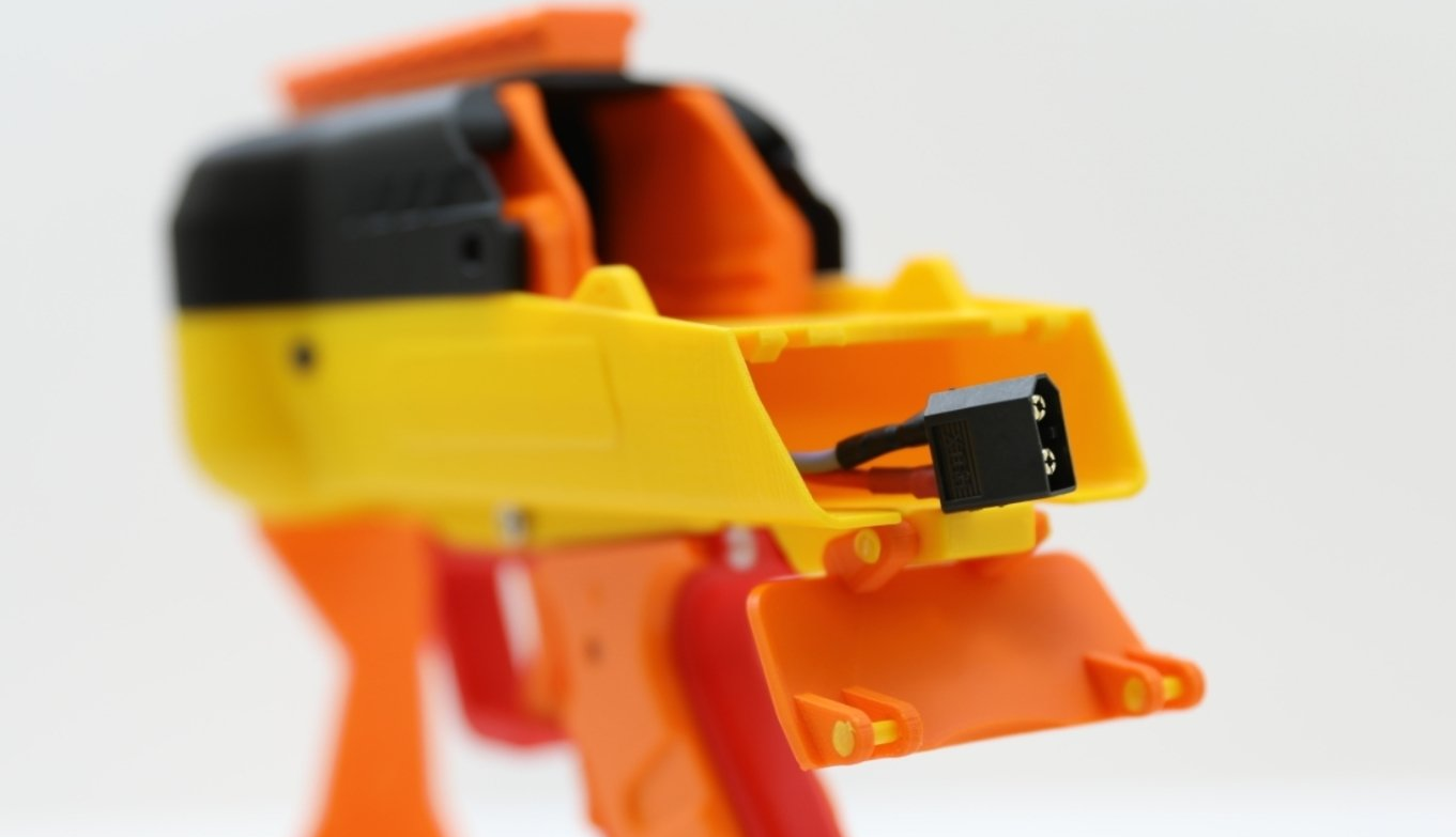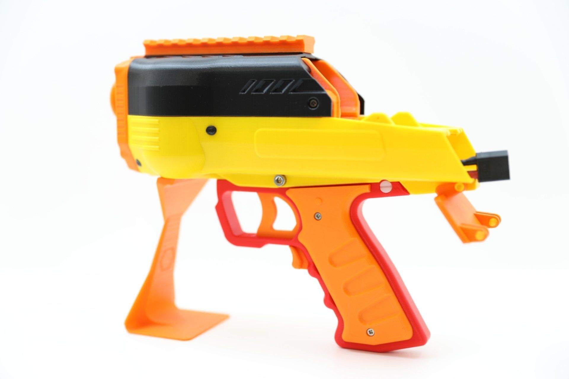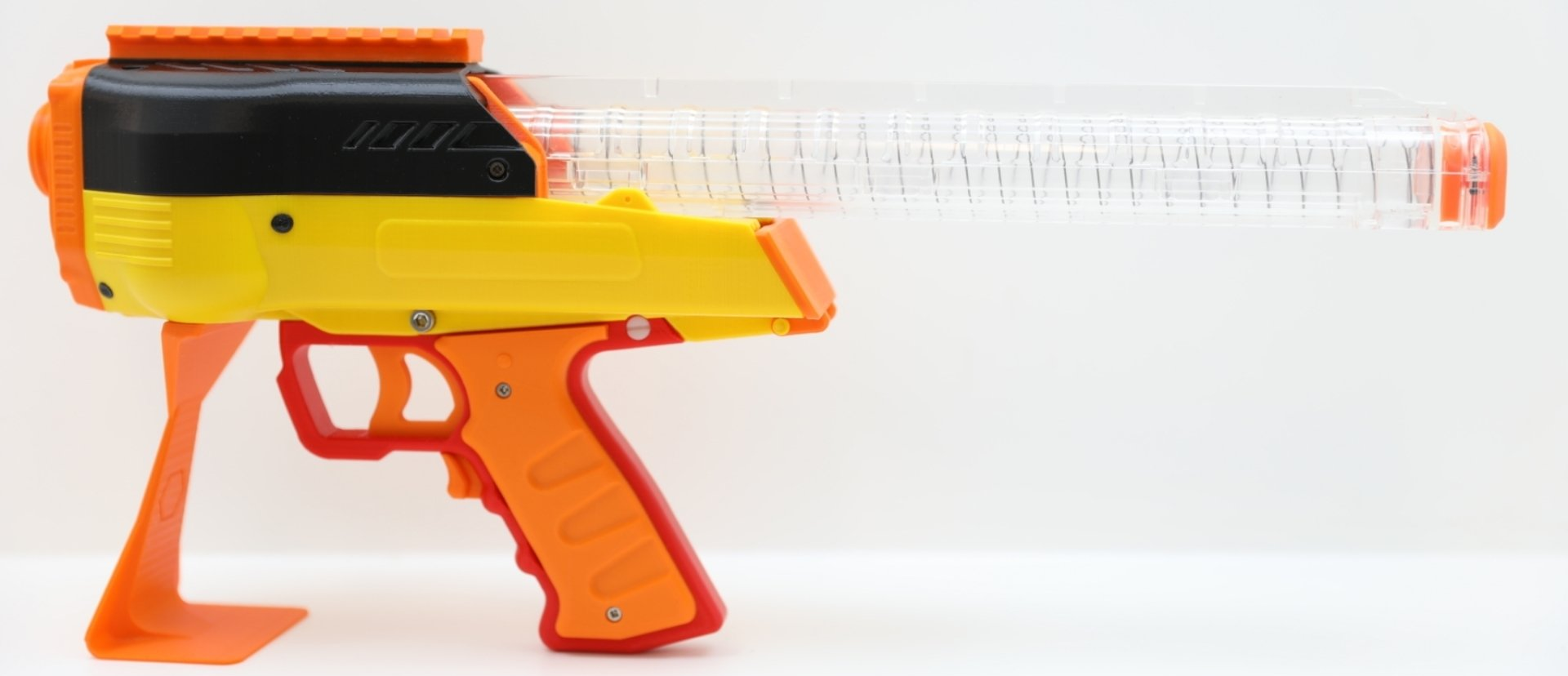 Currently, the NG-3 reaches a max 100fps with a 2s lipo setup. Ball type ammunition has a much shorter acceleration length compared to foam darts. So for the NG-3 the fly wheels had to be changed from the ground up. They are still 3D printed entirely in ABS.