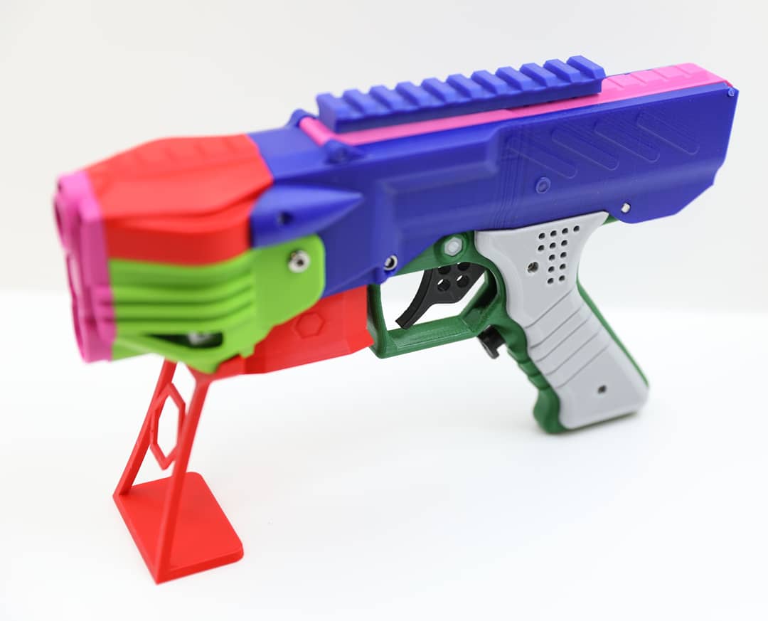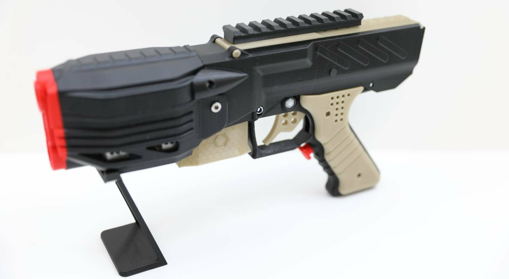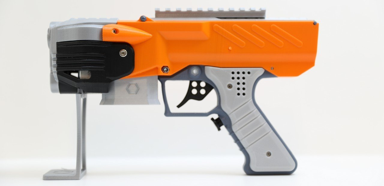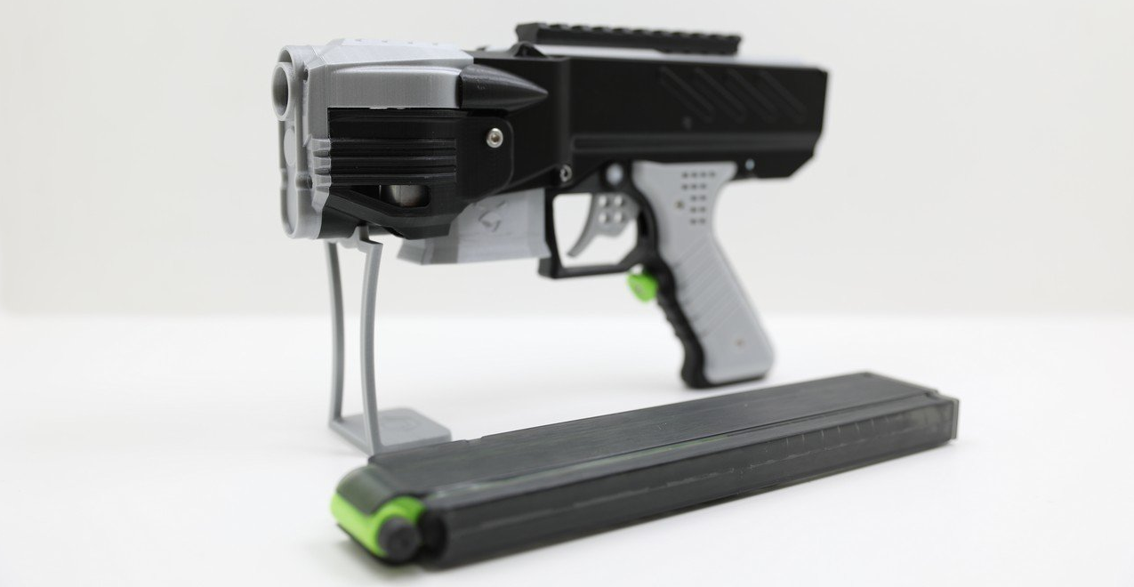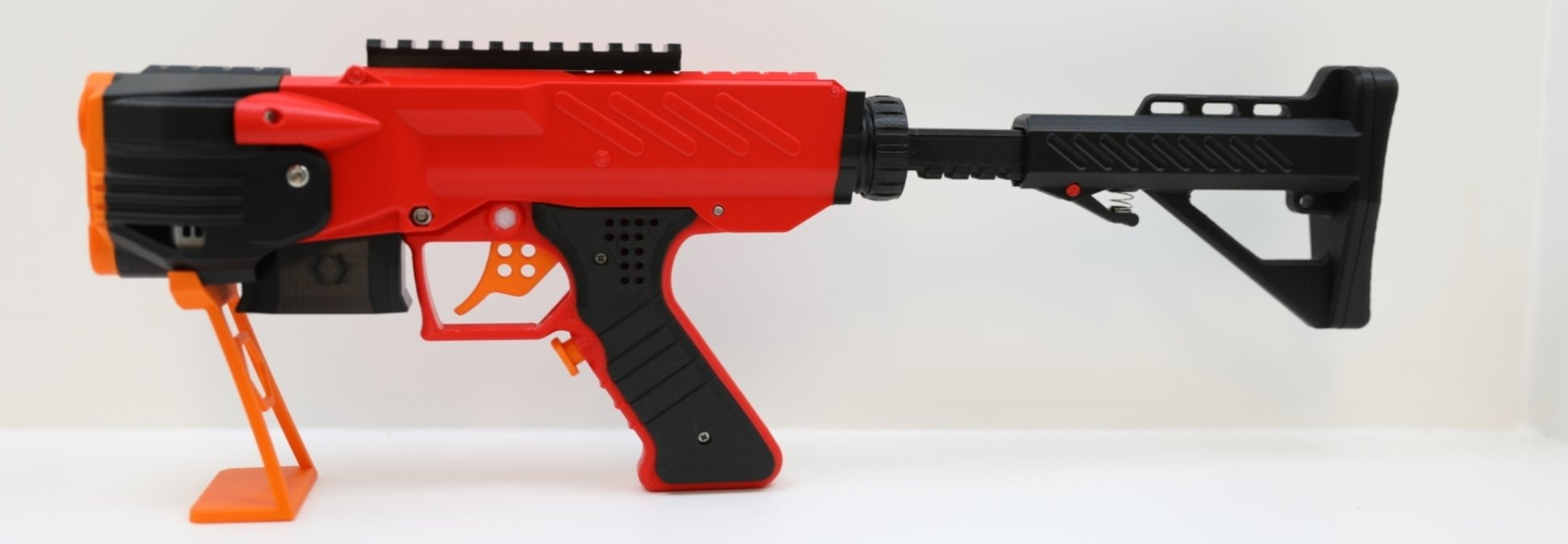 The NG-2 GOBLIN was designed in 2019 and basically follows the design philosophy of the original NG-1. But, as always, you learn. So the NG-2 was an effort to reduce the overall complexity of a blaster while optimizing it for easy printing and quick assembly. After all, 3Dprinting is rather scalable by simply investing in new machines. However, post processing, assembly, testing and shipping quickly become bottlenecks in production.