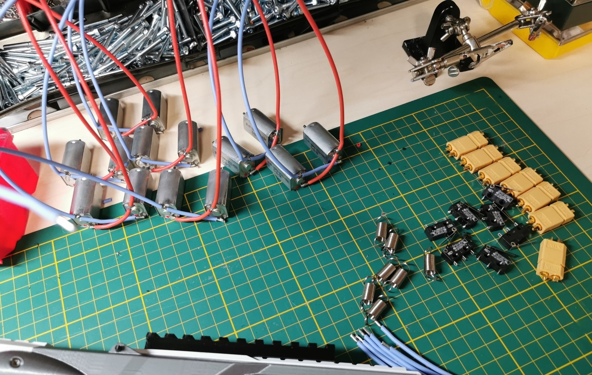 Minimal size was one of the early design drivers. So compared to the NG-1, which has massive 380 motor,, the GOBLIN features 180s. Simplicity was another driver. The choice to keep brushless motors was also a conscious one. Those run directly on DC from any battery. Weight specific power density is somewhat lower compared to brushless motor, but the effect is barely noticeable in this specific application. In contrast, no EMC is required. And, DC motors are readily available in bulk due to the fact that they are used in countless household items. The GOBLIN feature genuine high current switches and large gauge silicon wires.